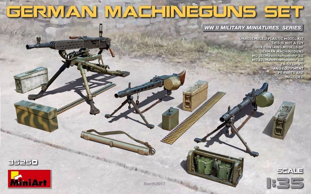 German Machine Gun set. Box contains models of german machineguns (Mg-34, MG-42, ZB-53). Kit contains 84 plastic parts and 38 PE parts.